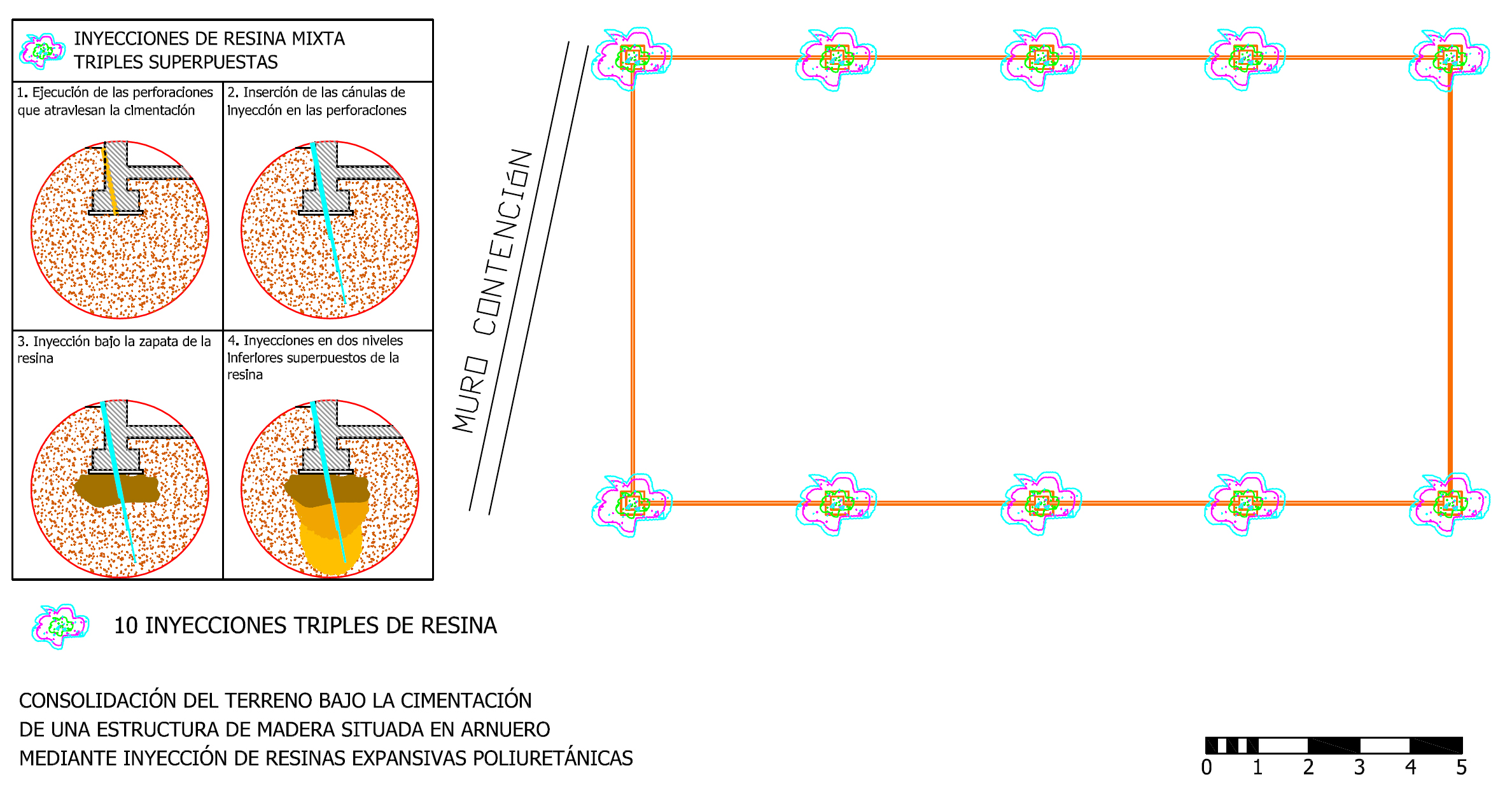 10 INYECCIONES TRIPLES EN TRES NIVELES SUPERPUESTOS DE RESINAS EXPANSIVAS, PARA CONSOLIDAR EL TERRENO BAJO LA CIMENTACIÓN. SOLUCION EJECUTADA.