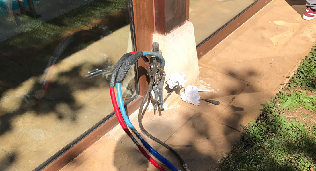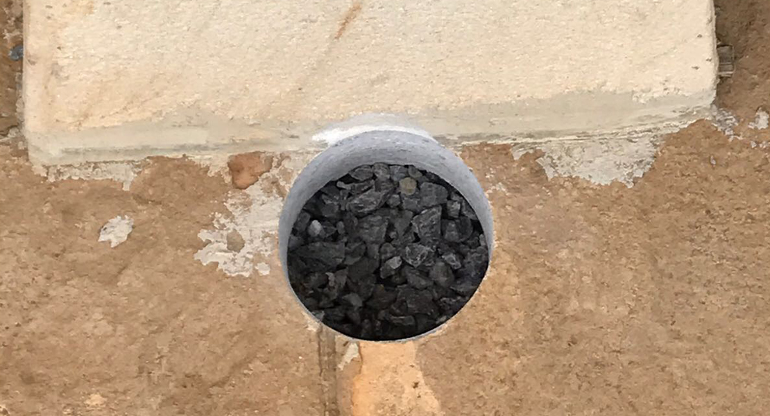 En la primera fase, se ejecutan las inyecciones justo debajo del plano de apoyo de la cimentación, utilizando la resina expansiva que por reacción química, expande hasta llegar a un estado sólido. Ésta rellena todas las oquedades presentes y crea un estrato entre la cimentación y el terreno de elevada resistencia a la compresión.