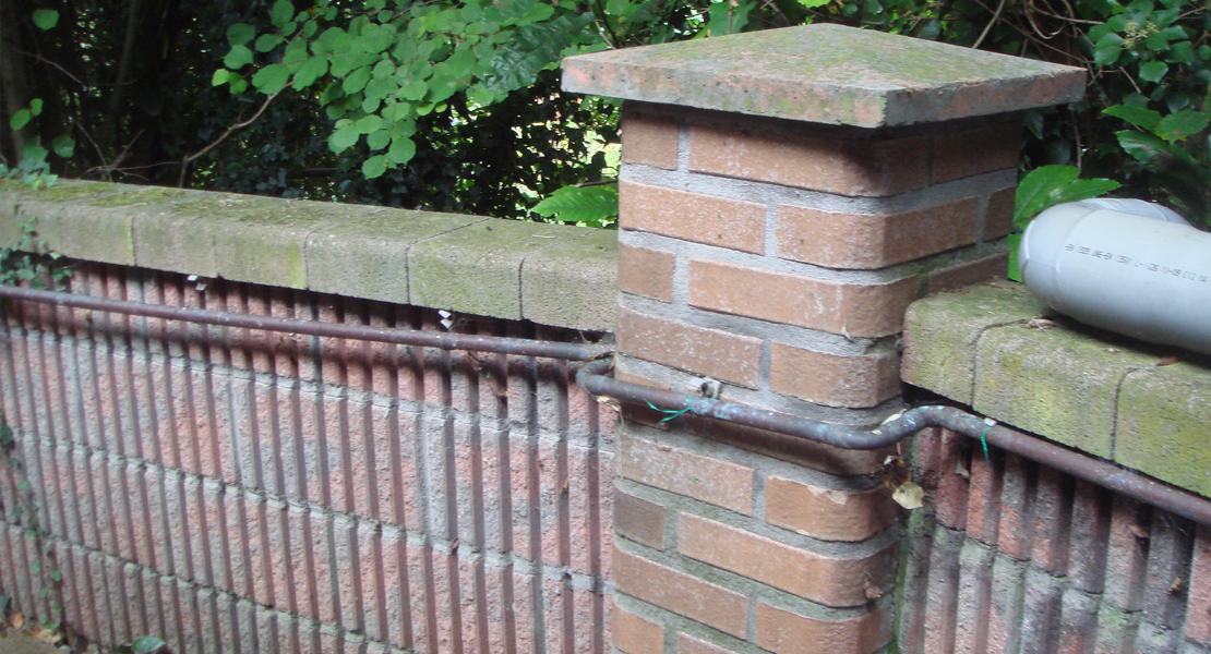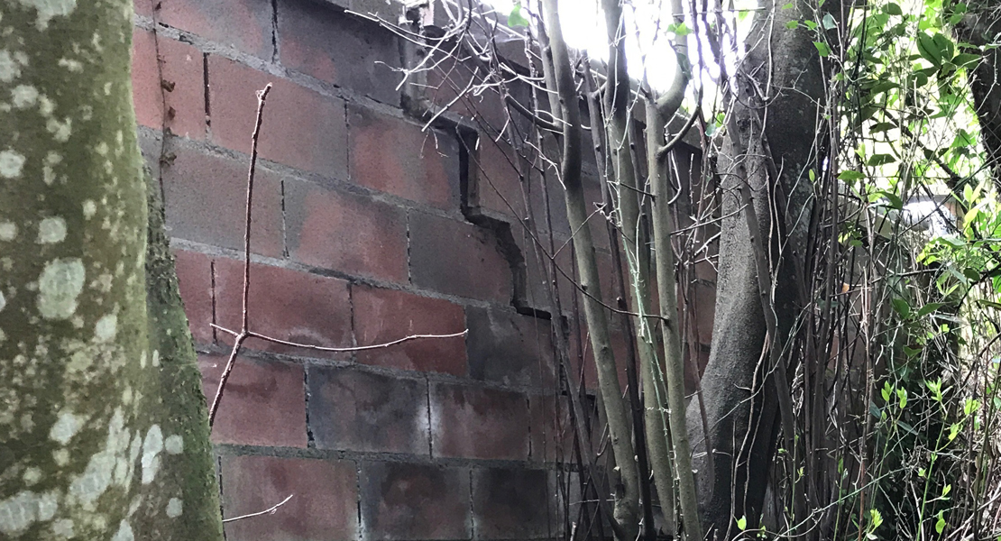 El muro de cierre está ejecutado con bloques de hormigón tipo split, presentando acabados rugosos en la parte exterior y experimenta desplazamientos y roturas por descensos.